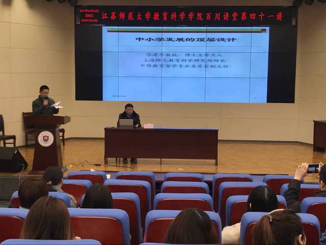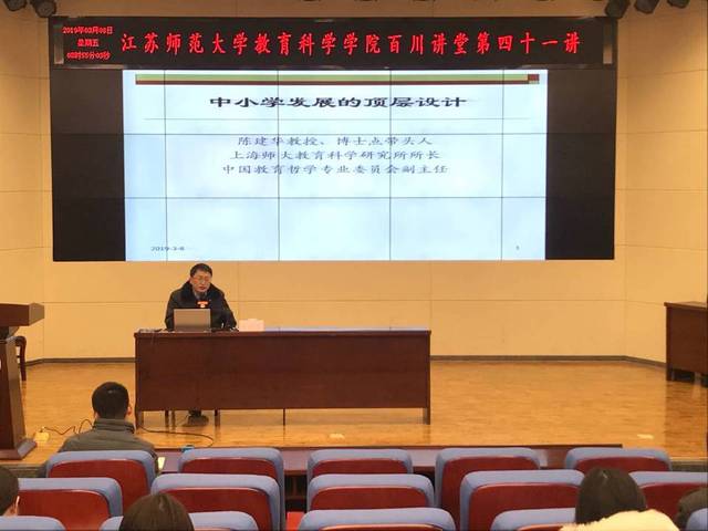 2019年03月8日上午,上海师范大学陈建华教授应邀在13号楼106报告厅为我院师生作了主题为“学校发展的顶层设计”的讲座。讲座由我院陈鹏副教授主持,我院研一、研二师生参加。