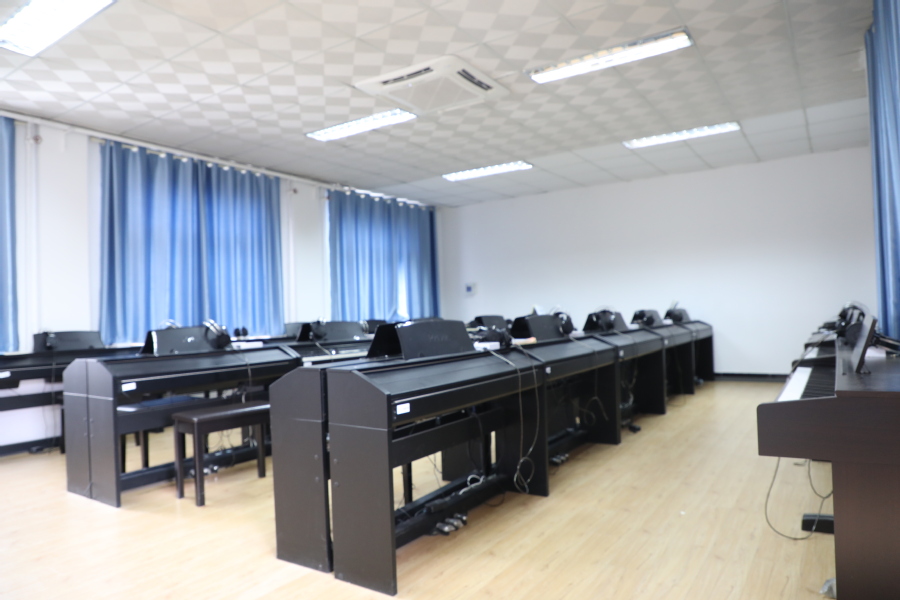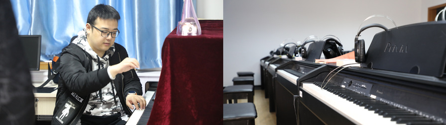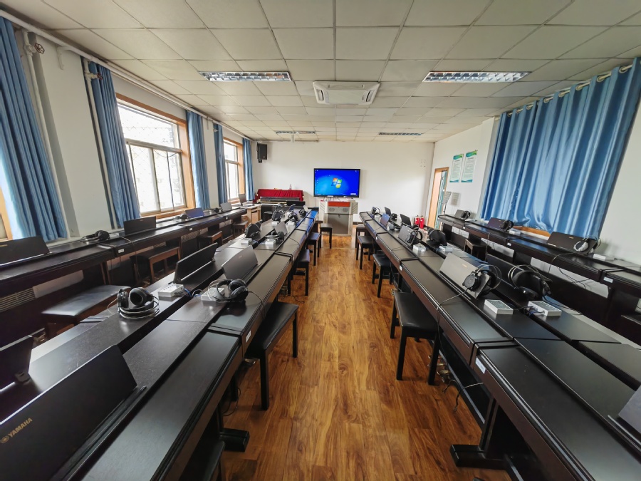 功能 介绍 | 两个电钢琴教室共配备61台电钢琴及主控教学系统,是实现音乐普教与集体训练的专业教室。师范生在此主要进行钢琴基础指法、儿歌伴奏编配、自弹自唱等核心技能的训练。教师可通过主控台进行统一示范、分组教学。 学前教育专业学生重点学习如何为幼儿歌曲配弹简易伴奏,以支持日常音乐活动;小学教育专业学生则侧重于掌握音乐课所需的弹唱能力及简单的合唱伴奏。集体授课模式极大地提高了教学效率,使每位学生都能在模拟课堂的氛围中,同步提升键盘技能与音乐教学组织能力。 |