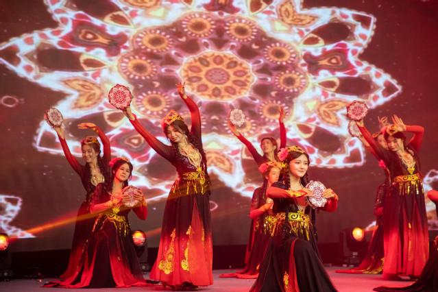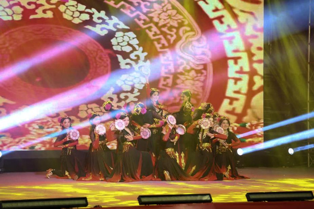 灵动的裙摆随节奏翩跹,铿锵的手鼓伴舞步飞扬。维吾尔族舞蹈以明快热烈的韵律、舒展奔放的姿态,将西域大地的热情与豪迈娓娓道来。舞者们旋转跳跃间,抖肩、翻腕的经典动作行云流水,不仅展现着维吾尔族人民能歌善舞的民族特质,更传递出对生活的热爱与对美好未来的憧憬,为整场演出注入浓郁的民族风情。
