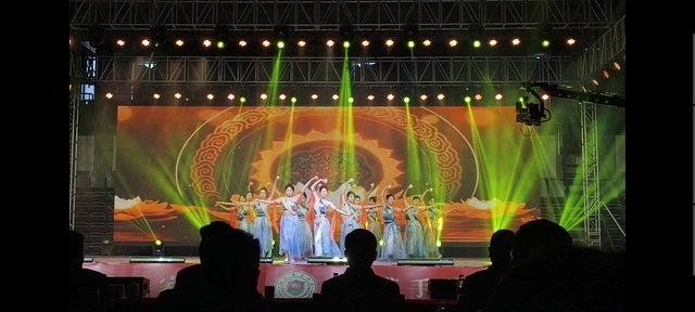 舞蹈特色鲜明,其动作柔美舒展,大量运用了“三道弯”体态和轻盈的旋转,模仿敦煌壁画中飞天的飘逸姿态。舞者手中执莲花灯等道具,再现了壁画经典的造型。该舞蹈深刻体现了多元融合的敦煌文化,动作语言汇融合了西域乐舞的灵动与中原舞蹈的韵律;音乐融合了梵呗、中原丝竹与西域胡乐的元素。整体上,节目生动展现了古代丝绸之路沿线各民族艺术交流互鉴的历史盛景,是敦煌文化包容性与创造力的舞台呈现。