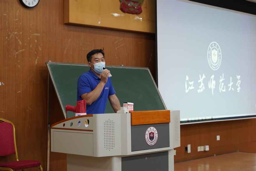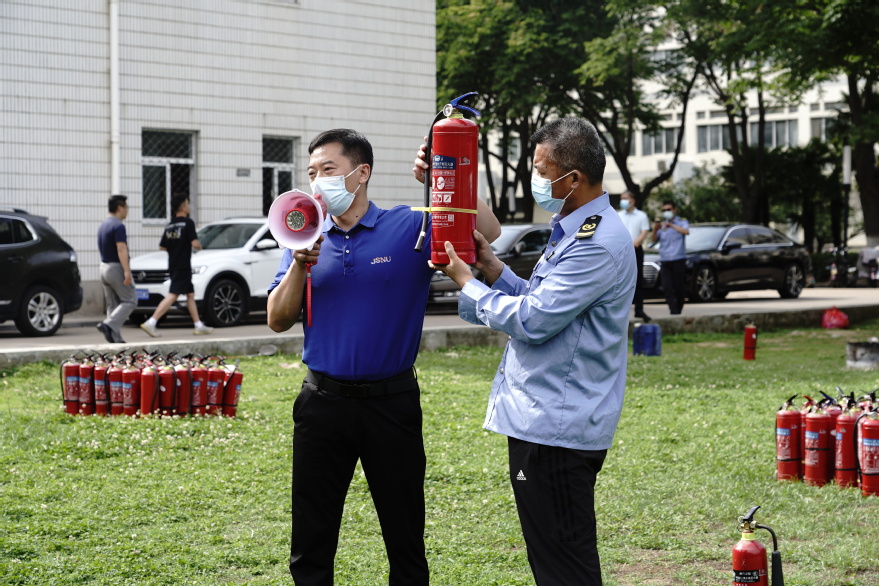 在操场上,赵科长按照“一提二拔三握四压”的方法,给大家讲解了灭火器的使用方法和如何扑救初期火灾,并进行了油盆灭火演示。随后,参与演练的师生依次上场,手持灭火器进行扑灭初起火灾的实战演练。全体人员热情饱满、踊跃参与,顺利完成了油盆灭火演练。
