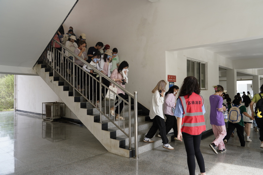 随后现场开展消防疏散逃生演练。在消防科赵远科长的指导下,全体师生使用毛巾捂鼻、弯腰前行,五分钟内从17#200B教室撤离至指定操场。