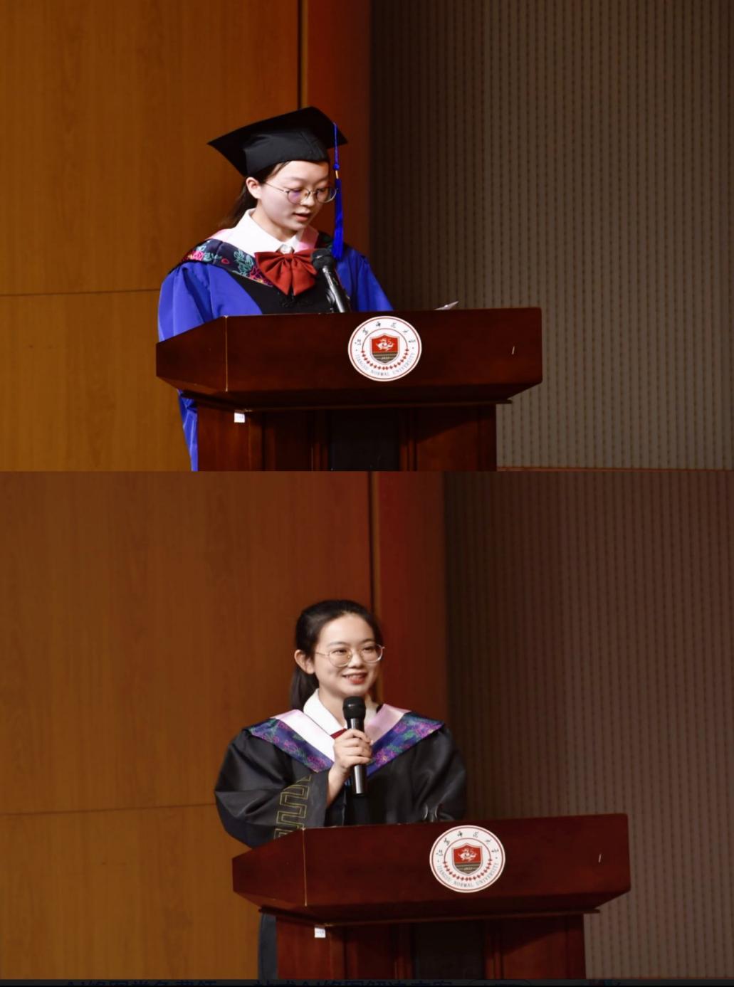 2023届优秀研究生代表匡永杨同学分享了自己研究生三年的点滴经历以及对学院老师的谆谆教导和辛苦付出表示感谢,并祝福所有毕业生们青春不悔,一路有光;优秀本科生代表叶子璇同学从学习、实践、成长三个方面叙述了大学四年的累累收获,表达对对学院老师的感恩与不舍以及对毕业生与学弟学妹们的美好祝愿。