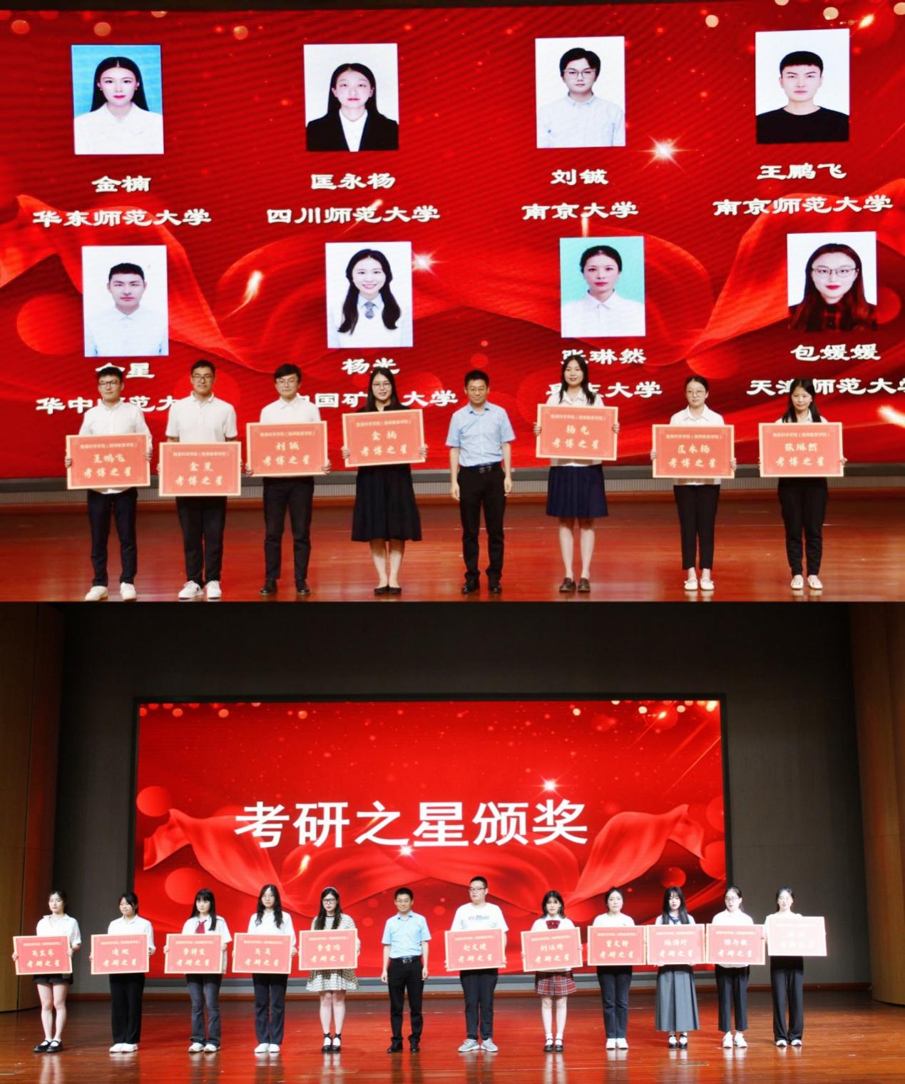 2023年教育科学学院考研考博率再创新高,教育科学学院副院长陈鹏为2023届考博、考研之星颁奖,并与他们合影留念;教师代表19教12班班主任王桃英老师为同学们送去了诚挚的祝福。她希望同学们不忘初心、诚信做人,以饱满的热情去迎接人生新的挑战,并衷心祝愿同学们前程锦绣,好运相伴!典礼最后,院党委书记贾林祥教授为毕业班班主任送上鲜花,感谢他们四年的辛苦付出。
