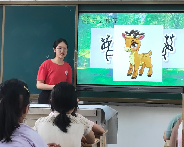 支教团成员黄佳瑞从甲骨文书写载体入手,简要介绍了甲骨文的发现与起源,通过具体甲骨文案例推出甲骨文的重要特点。同时,她别出心裁地设计了一个独特的教学情境——带领同学们进入旅行世界,展示旅途中出现的事物,并运用肢体动作模仿字形、渗透历史知识等多种方法让同学们在体验中理解、在实践中感悟。
