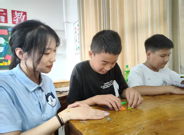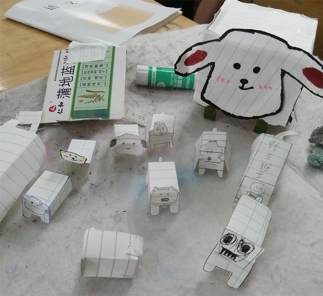 支教团成员鲁荟霖创造性地开设了《长方体展开图与立体小狗》的特色课,她通过微课视频演示正方体和长方体的展开方式,再在课堂上用课前制作的长方体模型沿棱剪开进行实物模拟,并总结长方体展开图的特点。最后,鲁荟霖由长方体的展开图拓展到制作立体纸板小狗,让学生们在奇妙的制作中感受平面展开图和立体图形之间的联系。