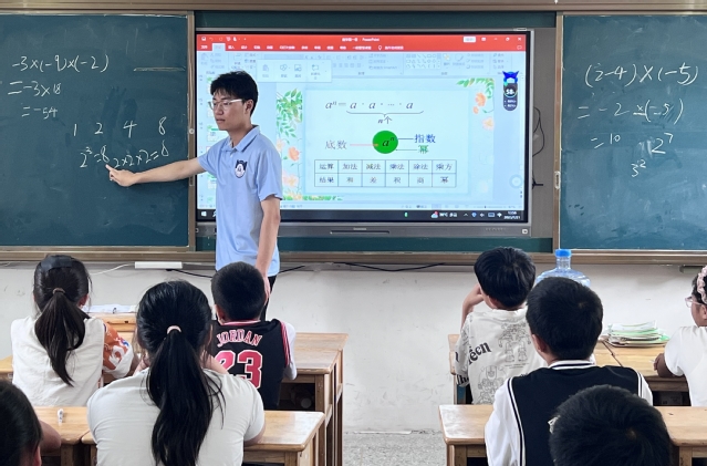 支教团成员党振延在数学课上为即将小升初的同学们介绍了一种全新的运算方式:幂(指数)。他主张积极鼓励的教学模式——无论对错,只要积极举手上台,便加以肯定并给予积分奖励,培养孩子们的自信独立意识。所以,基于上堂课内容,他出了三道综合题分别请三位同学上黑板作答来检验孩子们的复习情况。党振延同学的数学课教学节奏采用“一学一练,扎实每一步”的方式来进行,有复习巩固的意识,使学生们打好基础。