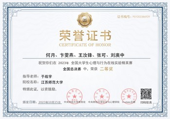 经过激烈的角逐,我院“桑代克的喵喵喵喵喵队伍”荣获全国总决赛二等奖,于战宇老师获得全国优秀指导教师称号,我校获最佳院校组织奖。此次比赛,我院心理学子不仅展现了出色的实验设计与分析能力,锻炼了沟通协作、解决问题的能力,更体悟到了“友谊”“团队精神”“传道受业解惑”“不放弃”等关键词的魅力。