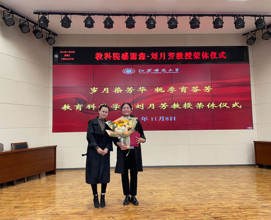 11月8日下午,教育科学学院教职员工在13号楼106报告厅为2023年度退休教师刘月芳教授举行了虽然简朴、但是热烈而隆重的“荣休仪式”。荣休仪式由院党委张欣书记主持。