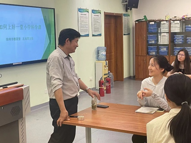 为引导学生更加深入、全面地理解和把握小学科学课的教学方法,提升我校学生的专业素养和教学水平,2024 年 5 月 15 日晚,教育科学学院于26号楼 104 开展“如何上好一堂小学科学课?”的专题报告。报告由徐州市教研室左兆军主任主讲,我校许正副教授、陈洪利副教授应邀开展专题研讨,参加教育部师范教育协同提质计划“行知杯”教师课堂教学能力大赛小学科学组校内决赛的入围选手、教育科学学院行知学堂学员以及部分小学教育专业研究生参加了本次活动。