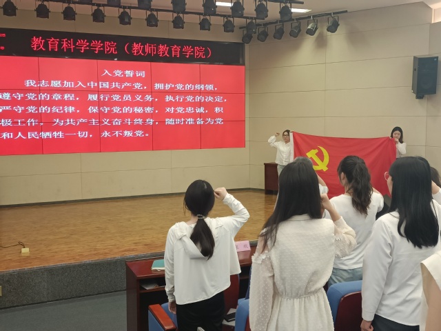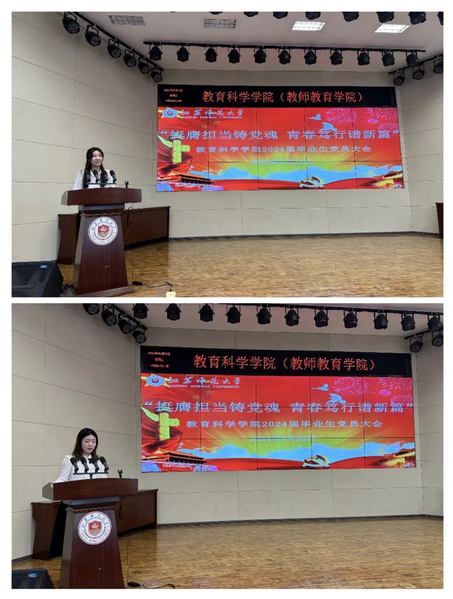 大会在庄严的国歌声中拉开帷幕。陈遥向即将毕业的党员们表示热烈的祝贺,对他们在校期间取得的成绩给予肯定。21级学前教育学专业常思雨和20级小学教育专业黄心怡作为毕业生党员代表发言。他们回顾和分享了自己作为一名党员的成长过程与心路历程,表达了对母校的不舍和感激之情并表示将时刻牢记党的嘱托,以实际行动践行党的宗旨,努力成长为堪当民族复兴重任的时代新人。在观看党纪学习视频后,陈遥带领毕业生党员们重温了入党誓词。