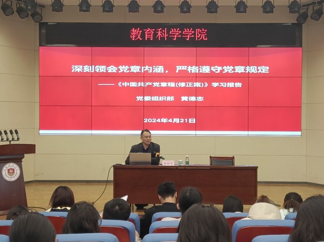 黄德志部长以习近平总书记的一段话为引入,肯定了党章的地位和学习意义。他从“党章及其修改”“二十大党章修改的十个要点”“党章基本内容”“做学习贯彻党章的模范”四个方面讲述了党章的完善过程和内容,重温了党的百年光辉历程。一百多年年来,党以自强不息的精神,从小小红船到巍巍巨轮,带领人民进行土地改革,抗日战争,解放战争,改革开放,到今天的中国特色社会主义新时代,无一不展现着中国奇迹。他希望同学们要认真学习党章,要立足个人政治思想、工作实际认真进行自我检视,并坚持边查边改、即知即改,学以致用,在中华民族伟大复兴的过程中奉献自己的力量。