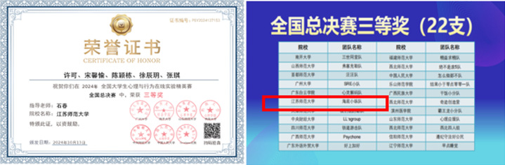 宋馨愉:非常荣幸参加这次的全国大学生心理与行为在线实验精英赛,这一次的参赛历程让我受益良多,在队长和老师的带领下,我们的项目一步步被完善,虽然中间也遇到过让人头疼的问题,但是我们众志成城,最终完成了任务,同时也获得了荣誉,但最重要的还是过程中我们收获了很多,学会了新的技能,精进了自己的本领,期待与伙伴们开启更精彩的旅程。